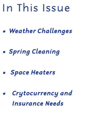 In This Issue • • • • Weather Challenges Spring Cleaning Space Heaters Crytocurrency and Insurance Needs