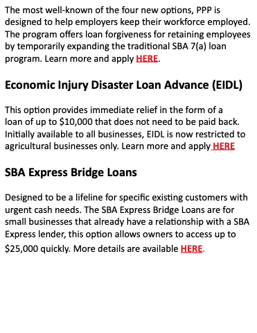 The most well-known of the the four new options PPP is designed to help employers keep their workforce employed The program offers loan loan forgiveness for for for retaining employees by temporarily expanding the traditional SBA 7(a) loan loan program Learn more and and apply HERE Economic Injury Disaster Loan Advance (EIDL)