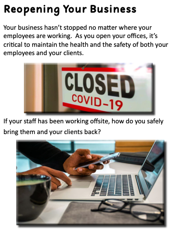Your business hasn’t stopped no matter where your your employees are working As you you you you open your your your offices it’s critical to maintain the the health and and the the safety o of both your your your employees and your clients If your staff has been working offsite how do you you safely bring them and your clients back?