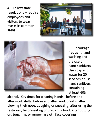 4 Follow state regulations – require employees and visitors to to wear masks in common areas 5 frequent hand washing and and the use of hand sanitizers Use soap and and water for 20 seconds or or use hand sanitizers containing