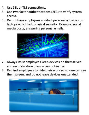 access 6 Do not have employees conduct personal activities on on on laptops which lack physical security Example: social media posts answering personal emails 7 Always insist employees keep devices on themselves and securely store them them when not in in in use 8 Remind employees to to hide their their work so no no no one can see their their screen and do not leave devices unattended