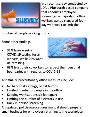 JDP a a a a a Pittsburgh based company that conducts employee screenings a a a a a a majority of o office workers want a a a a a a staggered four- day workweek to limit the number of people working onsite Some other findings: