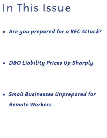 In This Issue • Are you prepared for a a a BEC Attack? • D&O Liability Prices Up Sharply • Small Businesses Unprepared for Remote Workers