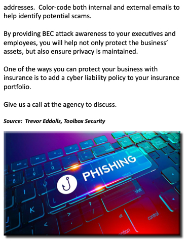 addresses Color-code both internal and external emails to help identify potential scams By providing BEC attack awareness to your executives and employees you you will help not only protect the business’ assets but also ensure