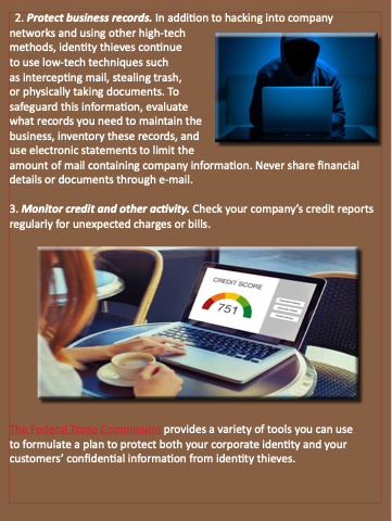 what records records you need to to maintain the the business inventory these records records and use electronic statements to to limit the the amount of mail mail containing company information Never share financial details or documents through e-mail 3 Monitor credit credit and other activity Check your company’s credit credit reports regularly for unexpected charges or or or bills The Federal Trade Commission provides a a a a a a a a a a variety of tools you you you can use to to to to formulate a a a a a a a a a a a a plan to to to to protect both your your corporate identity identity and your your customers’ confidential information from identity identity thieves