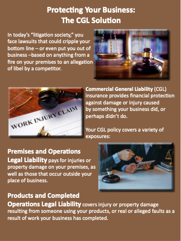 your premises to to an an allegation of libel by a competitor Commercial General Liability (CGL) insurance provides financial protection against damage or injury caused