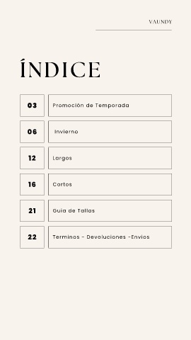 VAUNDY ÍNDICE 03 Promoción de Temporada 06 Invierno 12 Largos 16 Cortos 21 Guia de Tallas 22 Terminos - Devoluciones -Envios