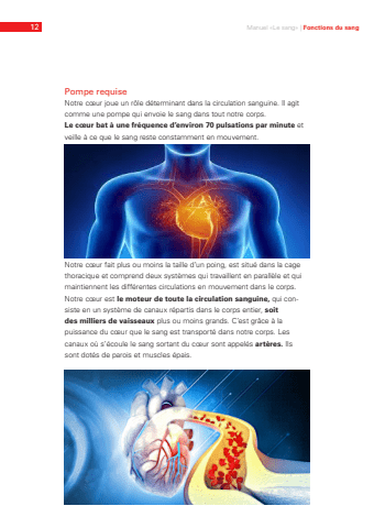 12 Manuel %u00abLe sang%u00bb | Fonctions du sangPompe requiseNotre c%u0153ur joue un r%u00f4le d%u00e9terminant dans la circulation sanguine. Il agit comme une pompe qui envoie le sang dans tout notre corps.Le c%u0153ur bat %u00e0 une fr%u00e9quence d%u2019environ 70 pulsations par minute et veille %u00e0 ce que le sang reste constamment en mouvement.Notre c%u0153ur fait plus ou moins la taille d%u2019un poing, est situ%u00e9 dans la cage thoracique et comprend deux syst%u00e8mes qui travaillent en parall%u00e8le et qui maintiennent les diff%u00e9rentes circulations en mouvement dans le corps. Notre c%u0153ur est le moteur de toute la circulation sanguine, qui consiste en un syst%u00e8me de canaux r%u00e9partis dans le corps entier, soit des milliers de vaisseaux plus ou moins grands. C%u2019est gr%u00e2ce %u00e0 la puissance du c%u0153ur que le sang est transport%u00e9 dans notre corps. Les canaux o%u00f9 s%u2019%u00e9coule le sang sortant du c%u0153ur sont appel%u00e9s art%u00e8res. Ils sont dot%u00e9s de parois et muscles %u00e9pais.