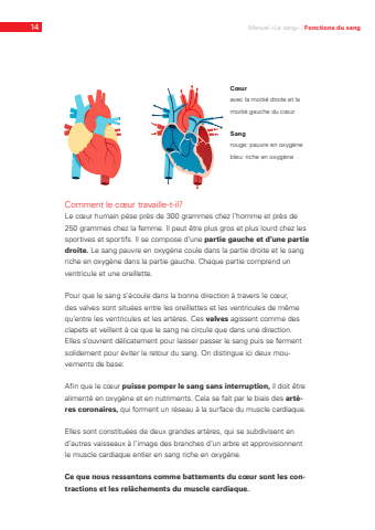 14Comment le c%u0153ur travaille-t-il?Le c%u0153ur humain p%u00e8se pr%u00e8s de 300 grammes chez l%u2019homme et pr%u00e8s de 250 grammes chez la femme. Il peut %u00eatre plus gros et plus lourd chez les sportives et sportifs. Il se compose d%u2019une partie gauche et d%u2019une partie droite. Le sang pauvre en oxyg%u00e8ne coule dans la partie droite et le sang riche en oxyg%u00e8ne dans la partie gauche. Chaque partie comprend un ventricule et une oreillette.Pour que le sang s%u2019%u00e9coule dans la bonne direction %u00e0 travers le c%u0153ur, des valves sont situ%u00e9es entre les oreillettes et les ventricules de m%u00eame qu%u2019entre les ventricules et les art%u00e8res. Ces valves agissent comme des clapets et veillent %u00e0 ce que le sang ne circule que dans une direction.Elles s%u2019ouvrent d%u00e9licatement pour laisser passer le sang puis se ferment solidement pour %u00e9viter le retour du sang. On distingue ici deux mouvements de base:Afin que le c%u0153ur puisse pomper le sang sans interruption, il doit %u00eatre aliment%u00e9 en oxyg%u00e8ne et en nutriments. Cela se fait par le biais des art%u00e8res coronaires, qui forment un r%u00e9seau %u00e0 la surface du muscle cardiaque.Elles sont constitu%u00e9es de deux grandes art%u00e8res, qui se subdivisent en d%u2019autres vaisseaux %u00e0 l%u2019image des branches d%u2019un arbre et approvisionnent le muscle cardiaque entier en sang riche en oxyg%u00e8ne.Ce que nous ressentons comme battements du c%u0153ur sont les contractions et les rel%u00e2chements du muscle cardiaque.C%u0153uravec la moiti%u00e9 droite et la moiti%u00e9 gauche du c%u0153urSang rouge: pauvre en oxyg%u00e8ne bleu: riche en oxyg%u00e8neManuel %u00abLe sang%u00bb | Fonctions du sang