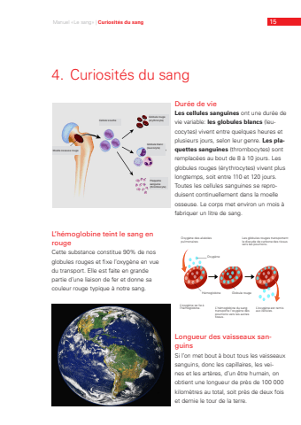Manuel %u00abLe sang%u00bb | Curiosit%u00e9s du sang 154. Curiosit%u00e9s du sangDur%u00e9e de vieLes cellules sanguines ont une dur%u00e9e de vie variable: les globules blancs (leucocytes) vivent entre quelques heures et plusieurs jours, selon leur genre. Les plaquettes sanguines (thrombocytes) sont remplac%u00e9es au bout de 8 %u00e0 10 jours. Les globules rouges (%u00e9rythrocytes) vivent plus longtemps, soit entre 110 et 120 jours.Toutes les cellules sanguines se reproduisent continuellement dans la moelle osseuse. Le corps met environ un mois %u00e0 fabriquer un litre de sang. L%u2019h%u00e9moglobine teint le sang en rougeCette substance constitue 90% de nos globules rouges et fixe l%u2019oxyg%u00e8ne en vue du transport. Elle est faite en grande partie d%u2019une liaison de fer et donne sa couleur rouge typique %u00e0 notre sang. Longueur des vaisseaux sanguinsSi l%u2019on met bout %u00e0 bout tous les vaisseaux sanguins, donc les capillaires, les veines et les art%u00e8res, d%u2019un %u00eatre humain, on obtient une longueur de pr%u00e8s de 100 000 kilom%u00e8tres au total, soit pr%u00e8s de deux fois et demie le tour de la terre.Moelle osseuse rouge Cellule soucheGlobule rouge (%u00e9rythrocyte)Globule blanc (leucocyte)Plaquette sanguine (thrombocyte)Oxyg%u00e8ne des alv%u00e9oles pulmonairesLes globules rouges transportent le dioxyde de carbone des tissus vers les poumons.Oxyg%u00e8neH%u00e9moglobine Globule rougeL%u2019oxyg%u00e8ne se lie %u00e0 l%u2019h%u00e9moglobine. L%u2019h%u00e9moglobine du sang transporte l%u2019oxyg%u00e8ne des poumons vers les autres tissus.L%u2019oxyg%u00e8ne est remis aux cellules.