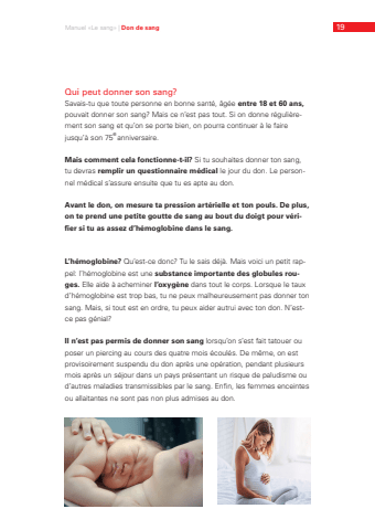 Manuel %u00abLe sang%u00bb | Don de sang 19Qui peut donner son sang?Savais-tu que toute personne en bonne sant%u00e9, %u00e2g%u00e9e entre 18 et 60 ans,pouvait donner son sang? Mais ce n%u2019est pas tout. Si on donne r%u00e9guli%u00e8rement son sang et qu%u2019on se porte bien, on pourra continuer %u00e0 le faire jusqu%u2019%u00e0 son 75 anniversaire.Mais comment cela fonctionne-t-il? Si tu souhaites donner ton sang, tu devras remplir un questionnaire m%u00e9dical le jour du don. Le personnel m%u00e9dical s%u2019assure ensuite que tu es apte au don.Avant le don, on mesure ta pression art%u00e9rielle et ton pouls. De plus, on te prend une petite goutte de sang au bout du doigt pour v%u00e9rifier si tu as assez d%u2019h%u00e9moglobine dans le sang.L%u2019h%u00e9moglobine? Qu%u2019est-ce donc? Tu le sais d%u00e9j%u00e0. Mais voici un petit rappel: l%u2019h%u00e9moglobine est une substance importante des globules rouges. Elle aide %u00e0 acheminer l%u2019oxyg%u00e8ne dans tout le corps. Lorsque le taux d%u2019h%u00e9moglobine est trop bas, tu ne peux malheureusement pas donner ton sang. Mais, si tout est en ordre, tu peux aider autrui avec ton don. N%u2019estce pas g%u00e9nial?Il n%u2019est pas permis de donner son sang lorsqu%u2019on s%u2019est fait tatouer ou poser un piercing au cours des quatre mois %u00e9coul%u00e9s. De m%u00eame, on est provisoirement suspendu du don apr%u00e8s une op%u00e9ration, pendant plusieurs mois apr%u00e8s un s%u00e9jour dans un pays pr%u00e9sentant un risque de paludisme ou d%u2019autres maladies transmissibles par le sang. Enfin, les femmes enceintes ou allaitantes ne sont pas non plus admises au don.e