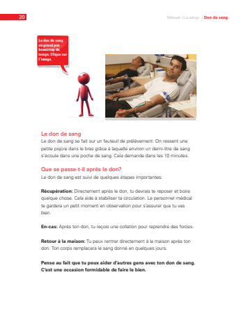 20 Manuel %u00abLe sang%u00bb | Don de sangLe don de sang ne prend pas beaucoup de temps. Clique sur l%u2019image.Le don de sangLe don de sang se fait sur un fauteuil de pr%u00e9l%u00e8vement. On ressent une petite piq%u00fbre dans le bras gr%u00e2ce %u00e0 laquelle environ un demi-litre de sang s%u2019%u00e9coule dans une poche de sang. Cela demande dans les 10 minutes.Que se passe-t-il apr%u00e8s le don?Le don de sang est suivi de quelques %u00e9tapes importantes:R%u00e9cup%u00e9ration: Directement apr%u00e8s le don, tu devrais te reposer et boire quelque chose. Cela aide %u00e0 stabiliser ta circulation. Le personnel m%u00e9dical te gardera un petit moment en observation pour s%u2019assurer que tu vas bien.En-cas: Apr%u00e8s ton don, tu re%u00e7ois une collation pour reprendre des forces. Retour %u00e0 la maison: Tu peux rentrer directement %u00e0 la maison apr%u00e8s ton don. Ton corps remplacera le sang donn%u00e9 en quelques jours.Pense au fait que tu peux aider d%u2019autres gens avec ton don de sang. C%u2019est une occasion formidable de faire le bien.