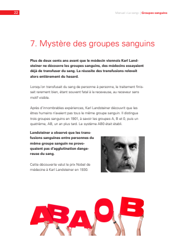22 Manuel %u00abLe sang%u00bb | Groupes sanguins7. Myst%u00e8re des groupes sanguins Plus de deux cents ans avant que le m%u00e9decin viennois Karl Landsteiner ne d%u00e9couvre les groupes sanguins, des m%u00e9decins essayaient d%u00e9j%u00e0 de transfuser du sang. La r%u00e9ussite des transfusions relevait alors enti%u00e8rement du hasard.Lorsqu%u2019on transfusait du sang de personne %u00e0 personne, le traitement finissait rarement bien, %u00e9tant souvent fatal %u00e0 la receveuse, au receveur sans motif visible.Apr%u00e8s d%u2019innombrables exp%u00e9riences, Karl Landsteiner d%u00e9couvrit que les %u00eatres humains n%u2019avaient pas tous le m%u00eame groupe sanguin. Il distingua trois groupes sanguins en 1901, %u00e0 savoir les groupes A, B et 0, puis un quatri%u00e8me, AB, un an plus tard. Le syst%u00e8me AB0 %u00e9tait %u00e9tabli.Landsteiner a observ%u00e9 que les transfusions sanguines entre personnes du m%u00eame groupe sanguin ne provoquaient pas d%u2019agglutination dangereuse du sang.Cette d%u00e9couverte valut le prix Nobel de m%u00e9decine %u00e0 Karl Landsteiner en 1930.