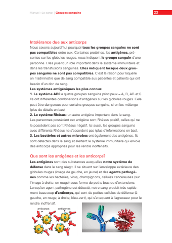 Manuel %u00abLe sang%u00bb | Groupes sanguins 23Intol%u00e9rance due aux anticorpsNous savons aujourd%u2019hui pourquoi tous les groupes sanguins ne sont pas compatibles entre eux. Certaines prot%u00e9ines, les antig%u00e8nes, pr%u00e9sentes sur les globules rouges, nous indiquent le groupe sanguin d%u2019une personne. Elles jouent un r%u00f4le important dans le syst%u00e8me immunitaire et dans les transfusions sanguines. Elles indiquent lorsque deux groupes sanguins ne sont pas compatibles. C%u2019est la raison pour laquelle on n%u2019administre que de sang compatible aux patientes et patients qui ont besoin d%u2019un don de sang.Les syst%u00e8mes antig%u00e9niques les plus connus:1. Le syst%u00e8me AB0 a quatre groupes sanguins principaux %u2013 A, B, AB et 0. Ils ont diff%u00e9rentes combinaisons d%u2019antig%u00e8nes sur les globules rouges. Cela peut %u00eatre dangereux pour certains groupes sanguins, si on les m%u00e9lange (plus de d%u00e9tails en bas).2. Le syst%u00e8me Rh%u00e9sus: un autre antig%u00e8ne important dans le sang.Les personnes poss%u00e9dant cet antig%u00e8ne sont Rh%u00e9sus positif, celles qui ne le poss%u00e8dent pas sont Rh%u00e9sus n%u00e9gatif. Ici aussi, les groupes sanguins avec diff%u00e9rents Rh%u00e9sus ne s%u2019accordent pas (plus d%u2019informations en bas).3. Les bact%u00e9ries et autres microbes ont %u00e9galement des antig%u00e8nes. Ils sont d%u00e9tect%u00e9s dans le sang et alertent le syst%u00e8me immunitaire qui envoie des anticorps appropri%u00e9s pour les rendre inoffensifs.Que sont les antig%u00e8nes et les anticorps?Les antig%u00e8nes sont des substances auxquelles notre syst%u00e8me de d%u00e9fense dans le sang r%u00e9agit. Il se situent sur l%u2019enveloppe ext%u00e9rieure des globules rouges (image de gauche, en jaune) et des agents pathog%u00e8nes comme les bact%u00e9ries, virus, champignons, cellules canc%u00e9reuses (sur l%u2019image %u00e0 droite, en rouge) sous forme de petits bras ou d%u2019extensions. Lorsqu%u2019un agent pathog%u00e8ne est d%u00e9tect%u00e9, notre sang produit tr%u00e8s rapidement beaucoup d%u2019anticorps, qui sont de petites cellules de d%u00e9fense (%u00e0 gauche, en rouge; %u00e0 droite, bleu-vert), qui s%u2019attaquent %u00e0 l%u2019agresseur pour le rendre inoffensif.anticorps antig%u00e8nes