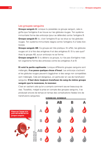 24 Manuel %u00abLe sang%u00bb | Groupes sanguinsAB B AB0DONNEUSE, DONNEURA0AB RECEVEUSE RECEVEURLes groupes sanguinsGroupe sanguin A: Lorsque tu poss%u00e8des ce groupe sanguin, cela signifie que l%u2019antig%u00e8ne A se trouve sur tes globules rouges. Ton syst%u00e8me immunitaire forme des anticorps (pour se d%u00e9fendre) contre l%u2019antig%u00e8ne B.Groupe sanguin B: Ici, c%u2019est l%u2019antig%u00e8ne B qui se situe sur les globules rouges. Ton syst%u00e8me immunitaire r%u00e9agira contre l%u2019antig%u00e8ne A %u00e0 l%u2019aide d%u2019anticorps.Groupe sanguin AB: Ce groupe est tr%u00e8s pratique. En effet, tes globules rouges ont %u00e0 la fois des antig%u00e8nes A et des antig%u00e8nes B. Et tu sais quoi? Avec le groupe AB, aucun anticorps ne se forme.Groupe sanguin 0: Si tu d%u00e9tiens ce groupe, tu n%u2019as pas d%u2019antig%u00e8ne mais ton organisme forme des anticorps contre les antig%u00e8nes A et B.Et voici la partie captivante: Lorsque diff%u00e9rents groupes sanguins sont m%u00e9lang%u00e9s, il se passe quelque chose d%u2019inou%u00ef. Les anticorps s%u2019activent et les globules rouges peuvent s%u2019agglutiner si des sangs non compatibles sont m%u00e9lang%u00e9s. Cela est dangereux, en particulier en cas de transfusion sanguine. Il faut donc toujours transfuser du sang du m%u00eame groupe sanguin que la receveuse, le receveur.C%u2019est en sachant cela qu%u2019on a compris comment sauver beaucoup de vies. Toutefois, malgr%u00e9 la prise en compte des groupes sanguins, il se produisait encore de temps en temps des complications fatales lors de transfusions sanguines. Clique sur l%u2019image et tu peux voir un film sur les groupes sanguins.