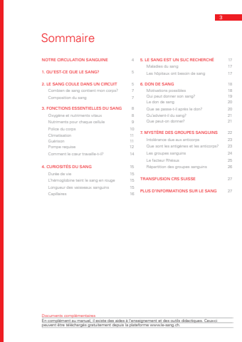 3NOTRE CIRCULATION SANGUINE 41. QU%u2019EST-CE QUE LE SANG? 52. LE SANG COULE DANS UN CIRCUIT 5Combien de sang contient mon corps? 7Composition du sang 73. FONCTIONS ESSENTIELLES DU SANG 8Oxyg%u00e8ne et nutriments vitaux 8Nutriments pour chaque cellule 9Police du corps 10Climatisation 11Gu%u00e9rison 11Pompe requise 12Comment le c%u0153ur travaille-t-il? 144. CURIOSIT%u00c9S DU SANG 15Dur%u00e9e de vie 15L%u2019h%u00e9moglobine teint le sang en rouge 15Longueur des vaisseaux sanguins 15Capillaires 16Documents compl%u00e9mentairesEn compl%u00e9ment au manuel, il existe des aides %u00e0 l%u2019enseignement et des outils didactiques. Ceux-ci peuvent %u00eatre t%u00e9l%u00e9charg%u00e9s gratuitement depuis la plateforme www.le-sang.ch.Sommaire5. LE SANG EST UN SUC RECHERCH%u00c9 17Maladies du sang 17Les h%u00f4pitaux ont besoin de sang 176. DON DE SANG 18Motivations possibles 18 Qui peut donner son sang? 19 Le don de sang 20Que se passe-t-il apr%u00e8s le don? 20 Qu%u2019advient-il du sang? 21 Que peut-on donner? 21 7. MYST%u00c8RE DES GROUPES SANGUINS 22Intol%u00e9rance due aux anticorps 23Que sont les antig%u00e8nes et les anticorps? 23Les groupes sanguins 24Le facteur Rh%u00e9sus 25R%u00e9partition des groupes sanguins 26 TRANSFUSION CRS SUISSE 27PLUS D%u2019INFORMATIONS SUR LE SANG 27