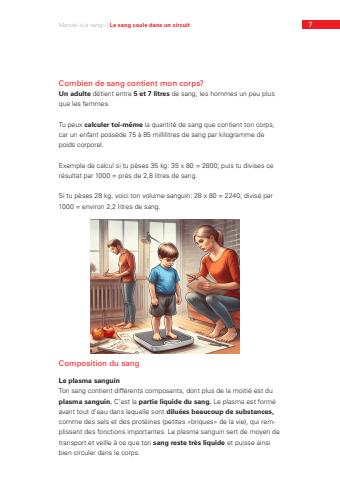 7Combien de sang contient mon corps?Un adulte d%u00e9tient entre 5 et 7 litres de sang, les hommes un peu plus que les femmes.Tu peux calculer toi-m%u00eame la quantit%u00e9 de sang que contient ton corps, car un enfant poss%u00e8de 75 %u00e0 85 millilitres de sang par kilogramme de poids corporel. Exemple de calcul si tu p%u00e8ses 35 kg: 35 x 80 = 2800; puis tu divises ce r%u00e9sultat par 1000 = pr%u00e8s de 2,8 litres de sang.Si tu p%u00e8ses 28 kg, voici ton volume sanguin: 28 x 80 = 2240; divis%u00e9 par 1000 = environ 2,2 litres de sang.Manuel %u00abLe sang%u00bb | Le sang coule dans un circuitComposition du sangLe plasma sanguinTon sang contient diff%u00e9rents composants, dont plus de la moiti%u00e9 est du plasma sanguin. C%u2019est la partie liquide du sang. Le plasma est form%u00e9 avant tout d%u2019eau dans laquelle sont dilu%u00e9es beaucoup de substances, comme des sels et des prot%u00e9ines (petites %u00abbriques%u00bb de la vie), qui remplissent des fonctions importantes. Le plasma sanguin sert de moyen de transport et veille %u00e0 ce que ton sang reste tr%u00e8s liquide et puisse ainsi bien circuler dans le corps.