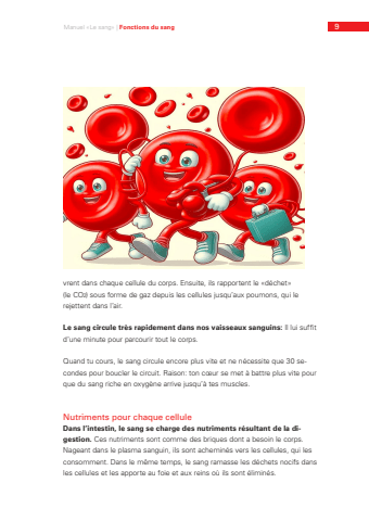 Manuel %u00abLe sang%u00bb | Fonctions du sang 9vrent dans chaque cellule du corps. Ensuite, ils rapportent le %u00abd%u00e9chet%u00bb (le CO ) sous forme de gaz depuis les cellules jusqu%u2019aux poumons, qui le rejettent dans l%u2019air.Le sang circule tr%u00e8s rapidement dans nos vaisseaux sanguins: Il lui suffit d%u2019une minute pour parcourir tout le corps.Quand tu cours, le sang circule encore plus vite et ne n%u00e9cessite que 30 secondes pour boucler le circuit. Raison: ton c%u0153ur se met %u00e0 battre plus vite pour que du sang riche en oxyg%u00e8ne arrive jusqu%u2019%u00e0 tes muscles.Nutriments pour chaque celluleDans l%u2019intestin, le sang se charge des nutriments r%u00e9sultant de la digestion. Ces nutriments sont comme des briques dont a besoin le corps. Nageant dans le plasma sanguin, ils sont achemin%u00e9s vers les cellules, qui les consomment. Dans le m%u00eame temps, le sang ramasse les d%u00e9chets nocifs dans les cellules et les apporte au foie et aux reins o%u00f9 ils sont %u00e9limin%u00e9s.2
