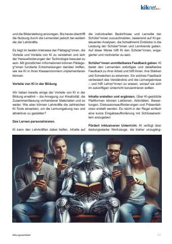 bildungswerkstatt13und die Bilderstellung anzuregen. Bis heute %u00fcbertrifft die Nutzung durch die Lernenden jedoch bei weitem die der Lehrkr%u00e4fte.Es liegt im besten Interesse der P%u00e4dagog*innen, die Vorteile und Vorteile von KI zu verstehen und sich der Herausforderungen der Technologie bewusst zu sein. Mit gr%u00fcndlichen Informationen k%u00f6nnen P%u00e4dagog*innen fundierte Entscheidungen dar%u00fcber treffen, wie sie KI in ihren Klassenzimmern implementieren k%u00f6nnen.Vorteile von KI in der BildungWir haben bereits einige der Vorteile von KI in der Bildung erw%u00e4hnt %u2013 die Anregung zur Kreativit%u00e4t, die Zusammenfassung vorhandener Materialien und so weiter. Wie aber k%u00f6nnen Lehrkr%u00e4fte die zahlreichen KI-Tools einsetzen, um die Lernumgebung neu und attraktiver zu gestalten?Das Lernen personalisieren.KI kann den Lehrkr%u00e4ften dabei helfen, Inhalte auf die individuellen Bed%u00fcrfnisse und Lernstile der Sch%u00fcler*innen zuzuschneiden, basierend auf KI-gesteuerten Analysen, die fortw%u00e4hrend Einblicke in die Leistung der Sch%u00fcler*innen und Lerntrends geben. Auf diese Weise hilft KI den Sch%u00fcler*innen, engagierter und motivierter zu sein.Sch%u00fcler*innen unmittelbares Feedback geben.KI bietet den Lernenden sofortiges und detailliertes Feedback zu ihrer Arbeit und hilft ihnen, ihre St%u00e4rken und Schw%u00e4chen zu erkennen. Ein solches Feedback verbessert das Verst%u00e4ndnis und die Lernergebnisse %u2013 und hilft Lehrer*innen zu wissen, worauf sie sichim zuk%u00fcnftigen Unterricht konzentrieren sollten.Inhalte erstellen und erg%u00e4nzen.%u00dcber KI-gest%u00fctzte Plattformen k%u00f6nnen Lektionen, Aktivit%u00e4ten, Bewertungen, Diskussionsaufforderungen und Pr%u00e4sentationen erstellt werden. Es reicht in der Regel einfach eine kurze Eingabeaufforderung mit Schl%u00fcsselw%u00f6rtern anzugeben.F%u00f6rdert inklusiveren Unterricht.KI verf%u00fcgt %u00fcber leistungsstarke Werkzeuge, die bisher unzug%u00e4ng-