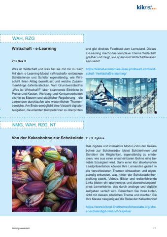 bildungswerkstatt233. Zyklus Im Zentrum stehen die Fragen %u00abWann ist ein Handel f%u00fcr alle Beteiligten fair?%u00bb und %u00abWie kann ich zufairem Handel beitragen?%u00bb. Aber auch die Auswirkungen eines ungerechten Handelssystems unddessen Folgen f%u00fcr beteiligte Parteien wird aufgezeigt. Im Werkstatt-Unterricht k%u00f6nnen anhand vonverschiedenen Produkten die Voraussetzungen undpositiven Auswirkungen im Einzelfall betrachtet underarbeitet werden.https://www.kiknet-maxhavelaar.org/ Globale Entwicklung und FriedenWirtschaft und KonsumFairer HandelAlbert Schweitzer Z3 / Sek IIWas ist Wirtschaft und was hat sie mit mir zu tun? Mit dem e-Learning-Modul %u00abWirtschaft%u00bb entdecken Sch%u00fclerinnen und Sch%u00fcler eigenst%u00e4ndig, wie Wirtschaft ihren Alltag beeinflusst und welche Zusammenh%u00e4nge dahinterstecken. Vom Grundverst%u00e4ndnis %u201eWas ist Wirtschaft?%u201c %u00fcber spannende Einblicke in Preise und Kosten, Werbung und Konsumverhalten bis hin zu Steuern und staatlicher Regulierung %u2013 die Lernenden durchlaufen alle wesentlichen Themenbereiche. Am Ende erm%u00f6glicht eine Vielzahl digitaler Aufgaben, die erlernten Kompetenzen zu %u00fcberpr%u00fcfen WAH, RZGWirtschaft - e-Learning 2. / 3. ZyklusDas digitale und interaktive Modul %u00abVon der Kakaobohne zur Schokolade%u00bb bietet Sch%u00fclerinnen und Sch%u00fclern die M%u00f6glichkeit, eigenst%u00e4ndig zu entdecken, wie aus einer unscheinbaren Bohne eine beliebte S%u00fcssigkeit wird. Dank einer klar strukturierten Leadpr%u00e4sentation k%u00f6nnen Ihre Lernenden gezielt in die verschiedenen Themen eintauchen und eigenst%u00e4ndig erkunden, was hinter der Schokoladenherstellung steckt. Videos, Bilder und weiterf%u00fchrende Links bieten ein spannendes und abwechslungsreiches Lernerlebnis, das durch analoge und digitale Aufgaben vertieft wird. Bereichern Sie Ihren Unterricht mit diesem k%u00f6stlichen Thema und machen Sie Ihre Klasse neugierig auf die Reise der Kakaobohne!https://www.kiknet-lindthomeofchocolate.org/choco-schule/digit-modul-2-3-zyklus/ NMG, WAH, RZG, NTVon der Kakaobohne zur Schokolade und gibt direktes Feedback zum Lernstand. Dieses E-Learning macht das komplexe Thema Wirtschaftgreifbar und zeigt, wie spannend Wirtschaftswissensein kann!https://kiknet-economiesuisse.jimdoweb.com/wirtschaft-1/wirtschaft-e-learning/