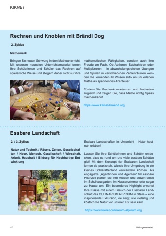 KIKNET46bildungswerkstatt2. ZyklusMathematikBringen Sie neuen Schwung in den Matheunterricht! Mit unserem neuesten Unterrichtsmaterial lernen Ihre Sch%u00fclerinnen und Sch%u00fcler das Rechnen auf spielerische Weise und steigern dabei nicht nur ihre Rechnen und Knoblen mit Br%u00e4ndi Dog 2. / 3. ZyklusNatur und Technik / R%u00e4ume, Zeiten, Gesellschaften / Natur, Mensch, Gesellschaft / Wirtschaft, Arbeit, Haushalt / Bildung f%u00fcr Nachhaltige EntwicklungEssbare Landschaftmathematischen F%u00e4higkeiten, sondern auch ihre Freude am Fach. Ob Addieren, Subtrahieren oder Multiplizieren %u2013 in abwechslungsreichen %u00dcbungen und Spielen in verschiedenen Zahlenr%u00e4umen wenden die Lernenden ihr Wissen aktiv an und erleben Mathe als spannendes Abenteuer.F%u00f6rdern Sie Rechenkompetenzen und Motivation zugleich und zeigen Sie, dass Mathe richtig Spass machen kann!https://www.kiknet-braendi.orgEssbare Landschaften im Unterricht %u2013 Natur hautnah erleben!Lassen Sie Ihre Sch%u00fclerinnen und Sch%u00fcler entdecken, dass es rund um uns viele essbare Sch%u00e4tze gibt! Mit dem Konzept der Essbaren Landschaft lernen sie praxisnah, wie sie ihre Umgebung in ein kleines Schlaraffenland verwandeln k%u00f6nnen. Als engagierte %u201eAgentinnen und Agenten%u201c f%u00fcr essbare Pflanzen planen sie ihre Mission und setzen diese im Schulhausgarten, im Klassenzimmer oder sogar zu Hause um. Ein besonderes Highlight erwartet Ihre Klasse mit einem Besuch der Essbaren Landschaft des CULINARIUM ALPINUM in Stans %u2013 eine inspirierende Exkursion, die zeigt, wie vielf%u00e4ltig und k%u00f6stlich die Natur vor unserer T%u00fcr sein kann. https://www.kiknet-culinarium-alpinum.org