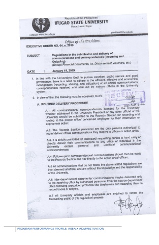 PROGRAM PERFORMANCE PROFILE: AREA X ADMINISTRATION
