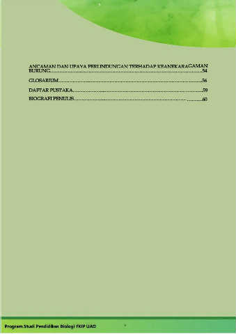 ANCAMAN DAN UPAYA PERLINDUNGAN TERHADAP KEANEKARAGAMAN BURUNG………………...………………………………………………………………….54 GLOSARIUM………………...……………………………………………………………..56 DAFTAR PUSTAKA………………...……………………………………………………..59 BIOGRAFI PENULIS………………...…………………………………………………….60 V5VI