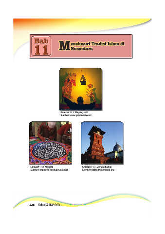 enelusuri Tradisi Islam di MNusantara Gambar 11.1. Wayang kulit Sumber: www.greatnesia.com Gambar 11.2. Kaligra Gambar 11.3. Menara Kudus Sumber: bandung.panduanwisata.id Sumber: upload.wikimedia.org 228 Kelas IX SMP/MTs
