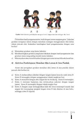 b) Siswa A menyikut dengan siku tangan kiri ke belakang. Siswa B menangkis.
