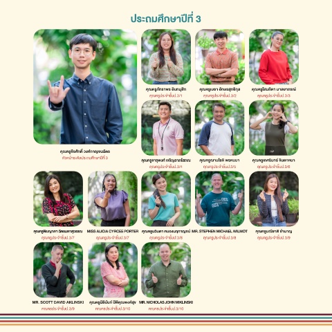 คุณครูพิมญ�ด� ฉัตรมห�สุวรรณ MISS ALICIA CYRCEE PORTER คุณครูนวินด� หนองนฤก�ญจน์ MR. STEPHEN MICHAEL WILMOT คุณครูมณีช�ติ ชำ�น�ญ