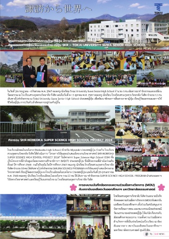 ในวนท 26 กรกฎาคม - 4 สงหาคม พ.ศ. 2567 คณะครู-นกเรยน Tokai University Suwa Senior High School จำานวน 4 คน เดินทางมาทำากิจกรรมแลกเปลียน