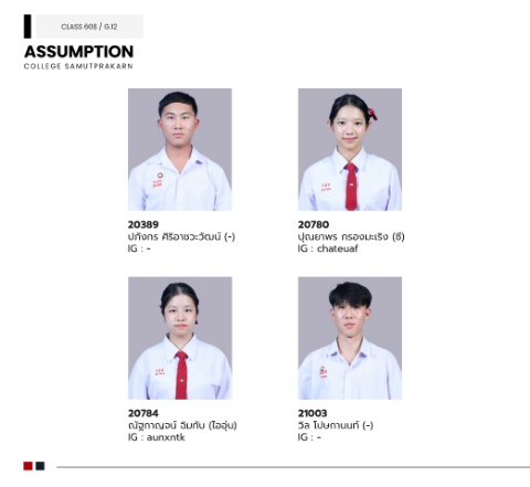 CLASS 608 / G.12 20389 20780 ปั้ภังกุร ศิริอิาชวะวัฒน์ (-) ปัุ้ณย์าพร กุรอิงมะเริง (ซี) IG : - IG : chateuaf 20784 21003 ั ณัฐกุาญจน์ ฉิมทับิ๊ (ไอิอิุ่น) วิล โปั้ษกุานนทั์ (-) IG : aunxntk IG : -