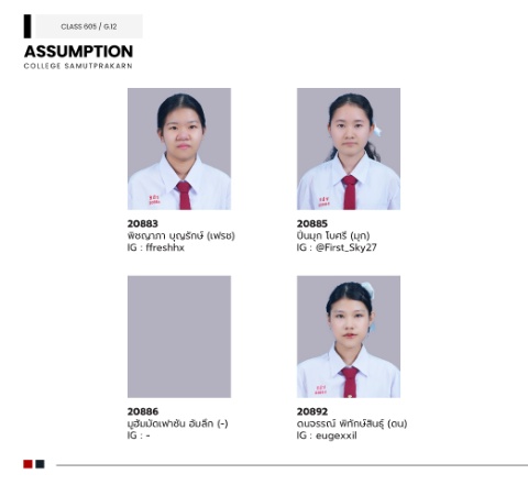 CLASS 605 / G.12 20883 20885 ิ ุ ั พชญาภา บิุ๊ญรกุษ์ (เฟรช) ปั้ิ � นมกุ โบิ๊ศรี (มกุ) ุ IG : ffreshhx IG : @First_Sky27 20886 20892 ั มฮัมมัดเฟาซัน อิัมล้กุ (-) ดนจรรณ์ พิทักุษ์สุินธุ์ (ดน) ู IG : - IG : eugexxil