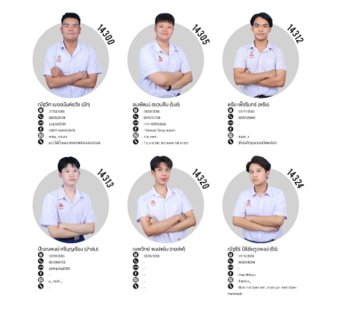 ณัฐวัศ เมฆ อนันต ธิ์วัช (นัท) 14300 ธิ์นพัฒน์ สุงวนจีน (ไนลื์) 14305 ตรัย เพ็ชรินทร์ (ตรัย) 14312