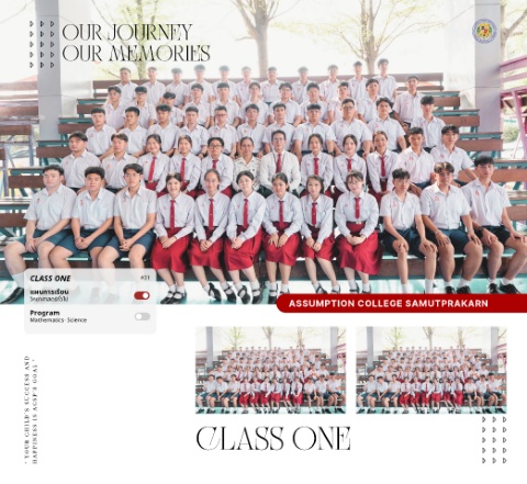 OUR JOURNEY OUR MEMORIES รวมหองแบบท 6 ี ่ CLASS ONE #31 แผนการเรียน วิทยาศาสตร์ท�วไป ั ASSUMPTION COLLEGE SAMUTPRAKARN Program Mathematics- Science “ Y O U R C H I L D ’ S S U C C E S S A N D H A P P I N E S S I S A C S P ’ S G O A L ” CLASS ONE