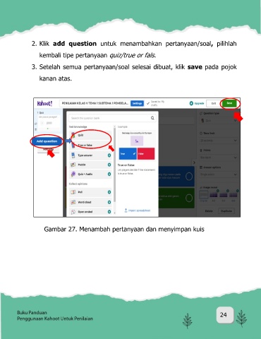 2. Klik add question untuk menambahkan pertanyaan/soal, pilihlah kembali tipe pertanyaan quiz/true or fals . 3. Setelah semua pertanyaan/soal selesai dibuat, klik save pada pojok kanan atas. Gambar 27. Menambah pertanyaan dan menyimpan kuis 24