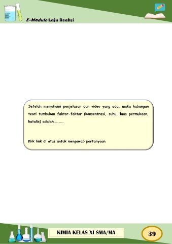 Setelah memahami penjelasan dan video yang ada, maka hubungan teori tumbukan faktor-faktor (konsentrasi, suhu, luas permukaan, katalis) adalah………… Klik link di atas untuk menjawab pertanyaan KIMIA KELAS XI SMA/MA 39