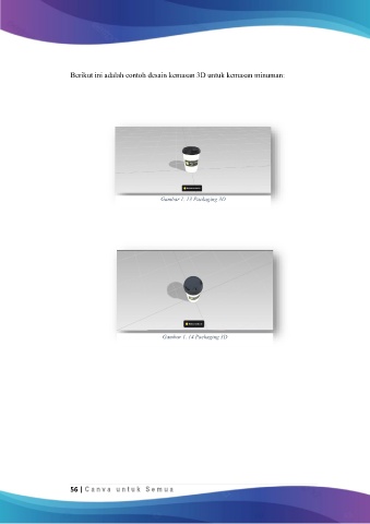 Berikut ini adalah contoh desain kemasan 3D untuk kemasan minuman: Gambar 1. 13 Packaging 3D Gambar 1. 14 Packaging 3D 56 | C a n v a u n t u k S e m u a