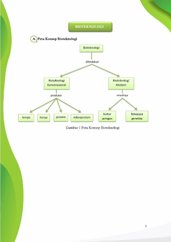BIOTEKNOLOGI A. Peta Konsep Bioteknologi Bioteknologi dibedakan Bioteknologi Bioteknologi Konvensiaonal Modern produksi misalnya Kultur Rekayasa tempe kecap protein mikroprotein jaringan genetika Gambar 1 Peta Konsep Bioteknologi 1
