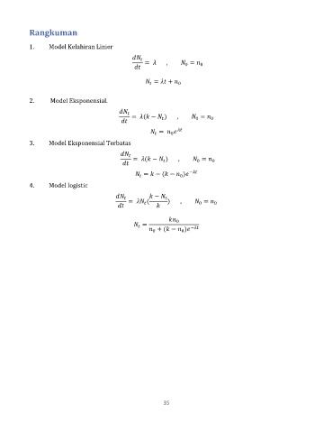 Rangkuman 1. Model Kelahiran Linier 0 0 = , = = 0 2. Model Eksponensial. = ( − ) , = 0 0 = 0 3. Model Eksponensial Terbatas 0 0 = ( − ) , = = − ( − ) − 0 4. Model logistic − = = ( ) , 0 0 = 0 ( − ) − 0 0 35