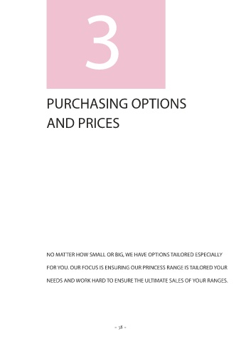3 PURCHASING OPTIONS AND PRICES NO MATTER HOW SMALL OR BIG, WE HAVE OPTIONS TAILORED ESPECIALLY FOR YOU. OUR FOCUS IS ENSURING OUR PRINCESS RANGE IS TAILORED YOUR NEEDS AND WORK HARD TO ENSURE THE ULTIMATE SALES OF YOUR RANGES. - 38 -