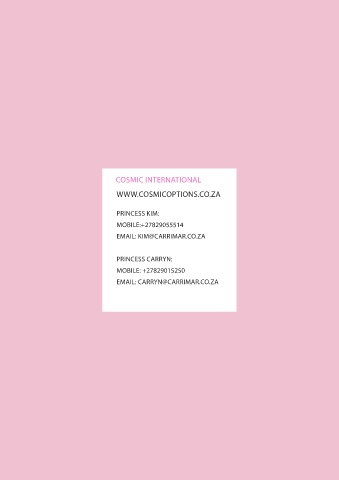 COSMIC INTERNATIONAL WWW.COSMICOPTIONS.CO.ZA PRINCESS KIM: MOBILE:+27829055514 EMAIL: KIM@CARRIMAR.CO.ZA PRINCESS CARRYN: MOBILE: +27829015250 EMAIL: CARRYN@CARRIMAR.CO.ZA