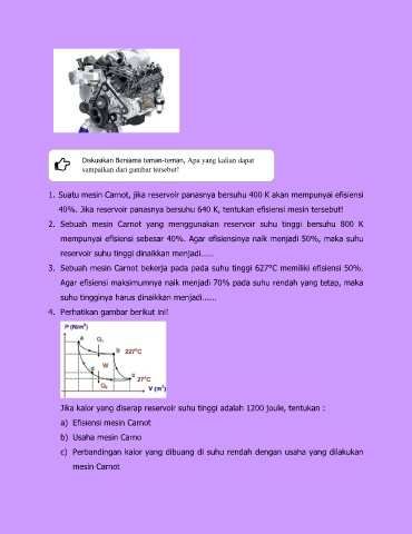 1. Suatu mesin Carnot, jika reservoir panasnya bersuhu 400 K akan mempunyai efisiensi