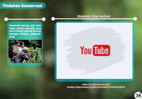 Tindakan Konservasi Simaklah Video Berikut! Konservasi burung opior jawa dalam bentuk Avitourism yang ada di Taman Nasional Gunung Merbabu (TNGMb) (Wahyudi, 2018) Video 2.0 Opior jawa di alam Sumber: https://www.youtube.com/watch?v=A6dwSGOBV4I 34