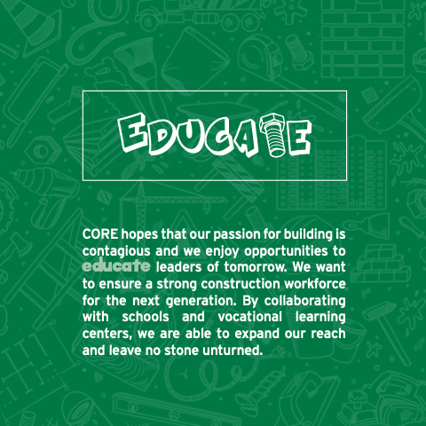 CORE hopes that our passion for building is contagious and we enjoy opportunities to educate leaders of tomorrow. We want to ensure a strong construction workforce for the next generation. By collaborating with schools and vocational learning centers, we are able to expand our reach and leave no stone unturned.