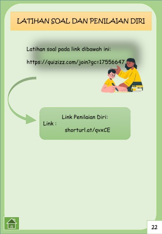 LATIHAN SOAL DAN PENILAIAN DIRI Latihan soal pada link dibawah ini: https://quizizz.com/join?gc=17556647 Link Penilaian Diri: = Link : shorturl.at/qvxCE 22