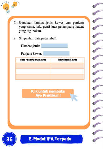 7. Gunakan hambat jenis kawat dan panjang yang sama, lalu ganti luas penampang kawat yang digunakan. 8. Simpanlah data pada tabel! Hambat jenis: Panjang kawat: Luas Penampang Kawat Hambatan Kawat Klik untuk membuka Ayo Praktikum! 36