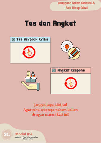 Gangguan Sistem Ekskresi & Pola Hidup Sehat Tes dan Angket Tes Berpikir Kritis Angket Respons Jangan lupa diisi ya! Agar tahu seberapa paham kalian dengan materi kali ini! 31. Modul IPA Oleh: 1. Nuri Vina Mawadah 2. Mirsya Adelia