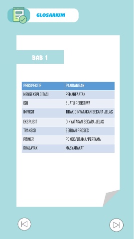 GLOSARIUM PERSPEKTIF PANDANGAN MENGEKSPLOITASI PEMANFAATAN ISU SUATU PERISTIWA IMPIISIT TIDAK DINYATAKAN SECARA JELAS EKSPLISIT DINYATAKAN SECARA JELAS TRANSISI SEBUAH PROSES PRIMER POKOK/UTAMA/PERTAMA KHALAYAK MASYARAKAT