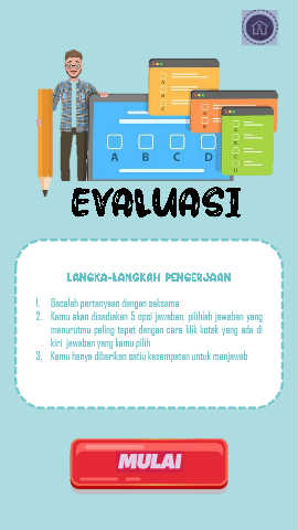 1. Bacalah pertanyaan dengan saksama 2. Kamu akan disediakan 5 opsi jawaban, pilihlah jawaban yang menurutmu paling tepat dengan cara klik kotak yang ada di kiri jawaban yang kamu pilih 3. Kamu hanya diberikan satiu kesempatan untuk menjawab MULAI
